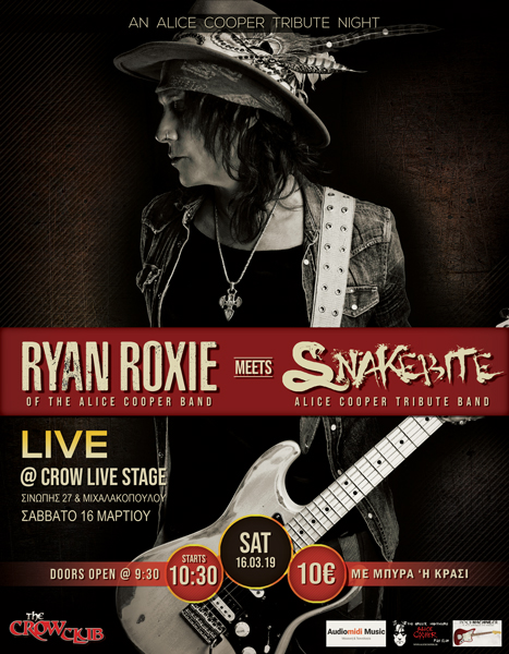 Όπως κάθε φορά το setlist θα καλύπτει τα πιο αντιπροσωπευτικά κομμάτια απο σχεδόν κάθε περίοδο της 50χρονης καριέρας του Alice Cooper, με όλους τους αξεπέραστους ύμνους του αλλά έχοντας αυτή τη φορά κάτι τελείως ξεχωριστό. Είναι ιδιαίτερη χαρά και τιμή για τους Snakebite, να υποδέχονται ως επίσημο προσκεκλημένο μαζί τους στη σκηνή τον επι πολλά χρόνια κιθαρίστα του Alice Cooper, Ryan Roxie. Ώς lead κιθαρίστας της μπάντας του Alice Cooper απο το 1996, ο Ryan Roxie έχει περιοδεύσει μαζί του αμέτρητες φορές, ενώ έχει συμμετάσχει στα studio albums: Brutal Planet, Dragontown, The Eyes Of Alice Cooper και Dirty Diamonds. Επίσης έχει συνεργαστεί με ονόματα όπως Electric Angels, Slash's Snakepit, Gilby Clarke αλλά έχει δημιουργήσει και προσωπικά projects όπως Roxie 77, Happy Pill και Casablanca. Το Σάββατο 16 Μαρτίου ετοιμαστείτε να ζήσετε μια βραδιά αφιερωμένη στον μοναδικό Alice Cooper με τον ίδιο του τον κιθαρίστα να συνοδεύει τους Snakebite. Η συναυλία ξεκινάει στις 10:30. Είσοδος 10 Ευρώ με μπύρα ή κρασί.