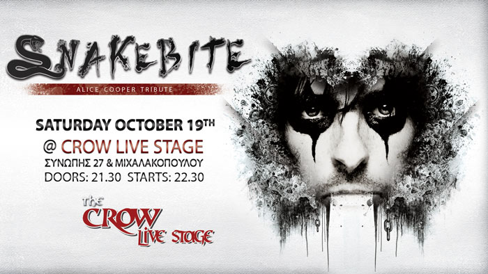 Οι Snakebite, η Ελληνική Tribute μπάντα του άρχοντα του shock rock, με την υποστήριξη του Ελληνικού Fan Club του Alice Cooper, σας προσκαλούν σε ένα ακόμα live τους το Σάββατο 19 Οκτωβρίου στο Crow Live Stage.