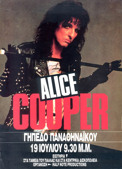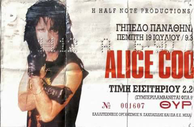 Στα πλαίσια της παγκόσμιας "Trashes The World" περιοδείας, την Πέμπτη 19 Ιουλίου 1990 ο Alice Cooper έρχεται για πρώτη φορά στην Ελλάδα και δίνει μια μοναδική συναυλία στο γήπεδο του Παναθηναϊκού.