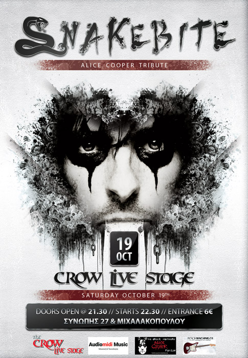 Οι Snakebite, η Ελληνική Tribute μπάντα του άρχοντα του shock rock, με την υποστήριξη του Ελληνικού Fan Club του Alice Cooper, σας προσκαλούν σε ένα ακόμα live τους το Σάββατο 19 Οκτωβρίου στο Crow Live Stage.