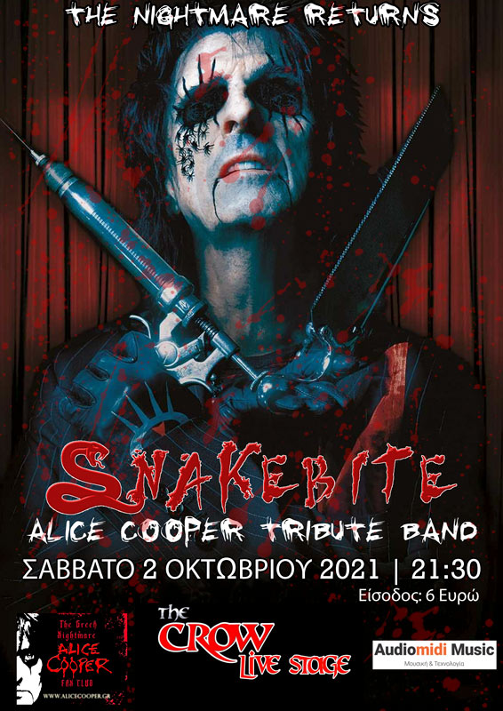 Οι Snakebite, η Ελληνική Tribute μπάντα του άρχοντα του shock rock, με την υποστήριξη του Ελληνικού Fan Club του Alice Cooper, σας προσκαλούν σε ένα ακόμα live τους το Σάββατο 2 Οκτωβρίου στο Crow Live Stage.