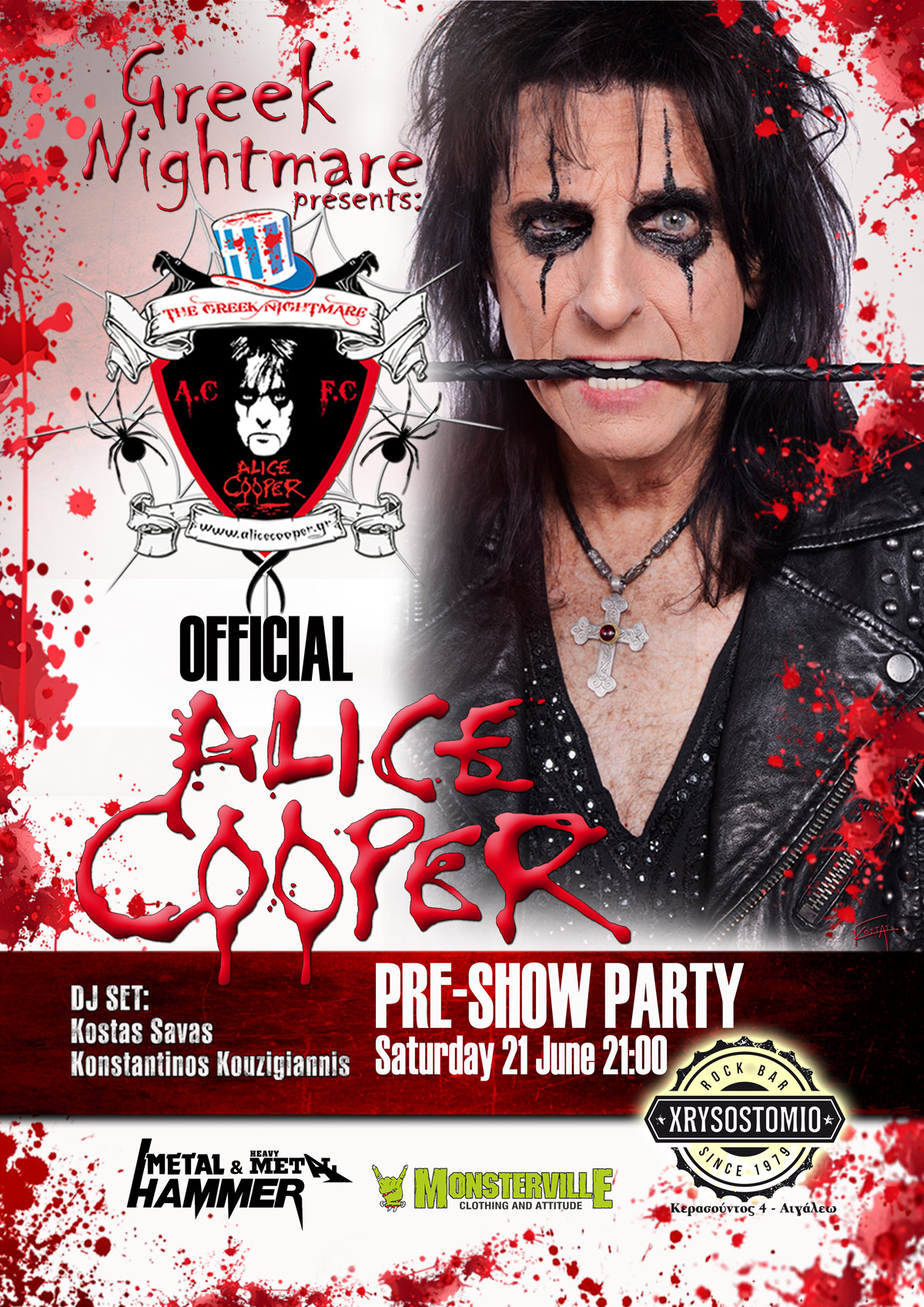 Το Ελληνικό fan club του Alice Cooper "The Greek Nightmare" έχει την τιμή να διοργανώνει το επίσημο Pre-show party για τη συναυλία στο Terra Vibe. Σε συνεργασία με το Metal Hammer, το Monsterville, το Rockwave Festival και την Xlalala, σας προσκαλούμε το Σάββατο 21 Ιουνίου στο Xrysostomio Rock Bar για να προετοιμαστούμε κατάλληλα με ένα μεγάλο αφιέρωμα.