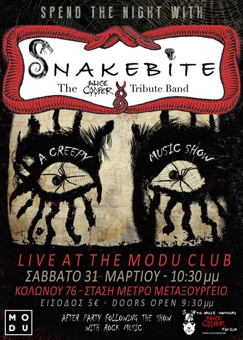 Ένα μουσικό show συνοδεύομενο από θεατρικά acts με ανάλογα σκηνικά βγαλμένα μέσα από τα όνειρα και τους εφιάλτες του καθενός. Οι Snakebite είναι μία νεοσύστατη μπάντα, τα μέλη της οποίας μοιράζονται, αφ' ενός την αγάπη για τη μουσική και αφ' ετέρου την αγάπη για τον Master του Shock Rock Alice Cooper. Είναι η μοναδική tribute μπάντα στην Ελλάδα για τον αγέρωχο Alice, και έχει σκοπό να κάνει γνωστή σε όλους τους Έλληνες την 50χρονη πορεία του στη δισκογραφία. Ο Alice Cooper είναι ένας ζωντανός θρύλος που έδώ και μισό αιώνα έχει επηρεάσει και συνεχίζει να επηρεάζει πολλές μπάντες με τη μουσική του. Έχοντας στο ενεργητικό του μία μεγάλη δισκογραφία και τραγούδια "διαμάντια" από τα τέλη της δεκαετίας του '60 έως και σήμερα, όλων των ειδών, από classic rock, μπαλάντες, ορχηστρικά, hard rock, μέχρι και jazz.